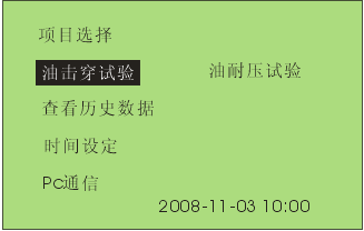 7 通過旋轉(zhuǎn)鼠標(biāo)可以選擇進(jìn)行擊穿試驗(yàn),耐壓試驗(yàn),查看歷史數(shù)據(jù),時(shí)間設(shè)定和PC通信等操作項(xiàng)目。